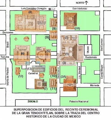 En primer lugar, nos encontramos con el "Templo Mayor" (1), también conocido como Huey Teocalli. La estructura urbana de Tenochtitlan tenía su epicentro en el Recinto Ceremonial, en torno al Templo Mayor, del cual partían las calzadas que se dirigían a las otras ciudades. En este sitio se rendía culto a dos dioses simultáneamente: aHuitzilopochtli, dios de la guerra y de la muerte, y a Tlaloc, dios de la lluvia y de la agricultura.Este Templo representaba el edificio más representativo e importante de la ciudad. La base piramidal estaba compuesta por cuatro cuerpos en inclinación, con un pasillo entre cada uno, construidos sobre una gran plataforma que medía aproximadamente 80 x 100 metros. Tenía dos escalinatas que se dirigían a la parte superior de la construcción, donde se encontraban las "capillas" de cada Dios (uno a la derecha: Tláloc, y otro a la izquierda: Huitzilopochtli). Cada una de las escalinatas, poseía cabezas de serpiente en su parte inferior. El Templo Mayor fue reedificado siete veces, ampliado once y su construcción se inició en el año 1390.