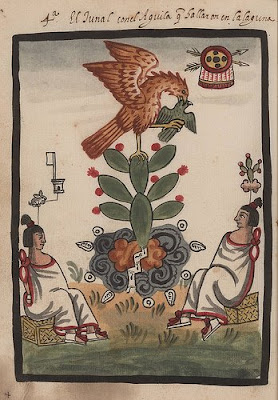 Cerca del año 1150, grupos de guerreros nómadas provenientes del norte, partieron con la idea de poblar el sur, invadiendo lo que hoy es la región central de México. Una de estas tribus era la formada por los aztecas, llamados así porque eran originarios de Aztlán (“Lugar de las garzas”).Una de las tantas versiones, cuenta que los aztecas fueron expulsados de Aztlán cuando Huitzilopochtli les ordenó buscar otro lugar y cambiar su nombre por el de mexicas. Otra versión, afirma que un día apareció un pájaro emitiendo un canto, que en náhuatl significaba "ya vámonos"; el pájaro repitió muchas veces este canto, y un hombre del pueblo logró convencer a los demás de que abandonaran el lugar. Con el tiempo, este hombre se convertiría en el dios Huitzilopochtli, quien guiaría a los mexicas al lugar prometido.